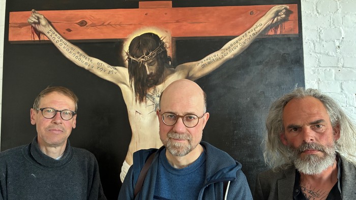 Atelier-Besuch bei dem Lemgoer Künstler Wolfgang Kessler, zusammen mit Nils Grube, dem Vorsitzenden des Lippischen Künstler-Bundes. Kessler hat einen gekreuzigten Christus von Velasquez kopiert und mit Tatoos versehen. Seligpreisungen der Bergpredigt auf den Armen Jesu, eine Taube auf dem Herzen - der Heilige Geist, der Jesus geleitet hat.