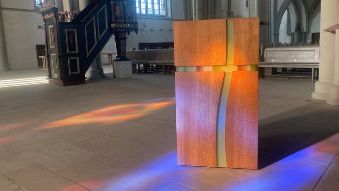 Rechtzeitig zu Ostern ist das Lesepult der Marienkirche überholt worden. Vor 15 Jahren von der Tischlerei "ungehobelt" in Zusammenarbeit mit einem Glaskünstler geschaffen, waren kleine Reparaturen und eine Erneuerung der Beleuchtung durch das Licht-Atelier Klaus Küster nötig. Das Licht kann man jetzt dimmen, das Holz ist frisch geölt. Ostern kann kommen!