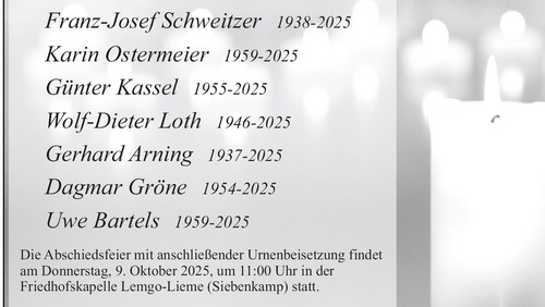 Für diese Menschen findet nächste Woche eine Trauerfeier mit Beisetzung der Urnen in Lemgo-Lieme statt. Für einige ist keine Kontaktperson bekannt. Wenn jemand sie kennt, wäre es schön, wenn sie/er sich bei Pastor Altevogt meldet, damit an ihn/sie persönlich erinnert werden kann. Tel. 05261/4981. Bitte auch auf Anrufbeantworter sprechen, Pastor Altevogt ruft zurück.